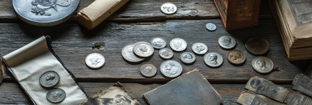 Antique coins and stamps are meticulously arranged on a rustic wooden surface, reflecting the beauty of vintage collectibles and history.