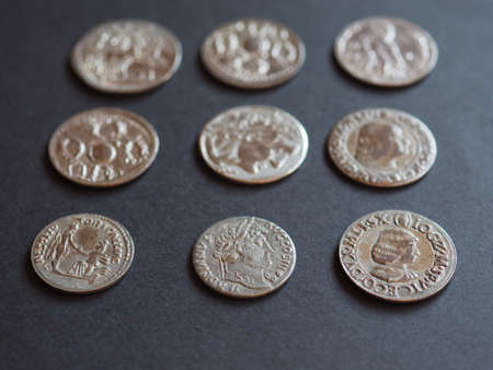 Closeup view of medieval European gold and silver coins.Old Polish coins.Zygmunt III Waza.Ancient gold and silver coins.Numismatics.silver coins covered in dirt.Antikvariat.