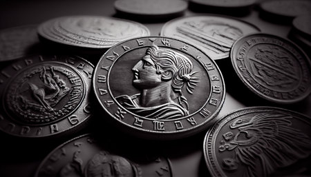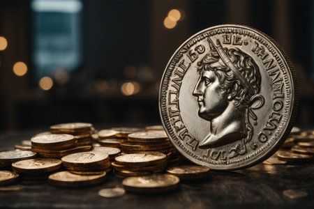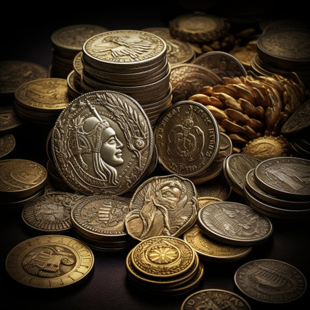 Coins featuring a historical figure lie among various metallic currency on a reflective surface in a captivating arrangement