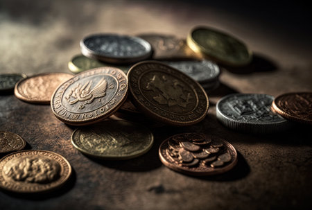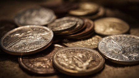 This stunning close-up image features a pile of vintage coins on a rustic surface, emphasizing their distinct textures and intricate details. Perfect for finance themes.