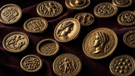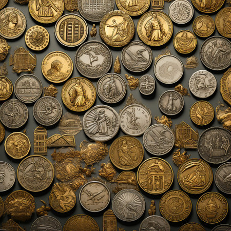 A diverse array of ancient coins showing vibrant colors and intricate engravings, highlighting their historical significance and artistry.