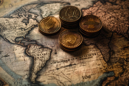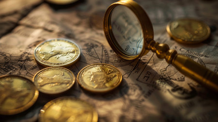 A collection of vintage coins with a magnifying glass on a detailed old map, symbolizing history, exploration, and antique treasures.