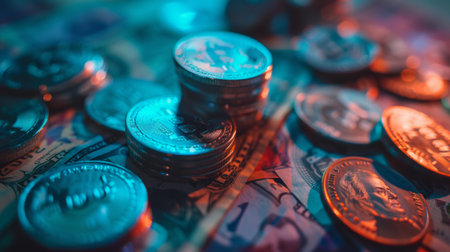Close-up of cryptocurrency coins on top of various banknotes, symbolizing digital currency, finance, and investment in blockchain.
