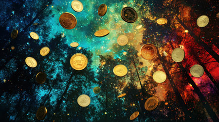 A captivating scene depicting coins floating through a colorful cosmic background, surrounded by a serene forest, creating a dreamlike atmosphere.