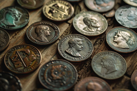 Pile of antique coins featuring famous historical figures is lying on a wooden surface