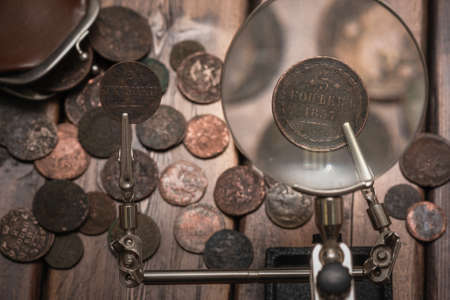 Numismatics. Old collectible coins made of silver on a wooden table.Coins in the album.Collection of old coins. Magnifying glass
