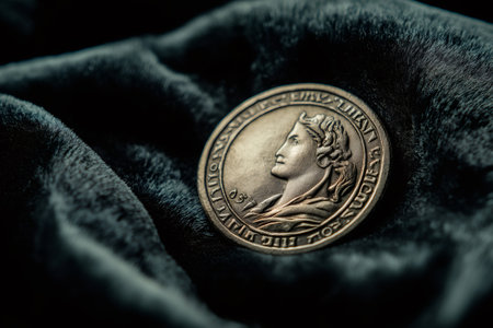 Close-up of a vintage coin with a historic design, displayed on a textured surface for collectors