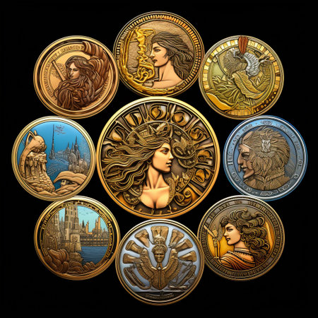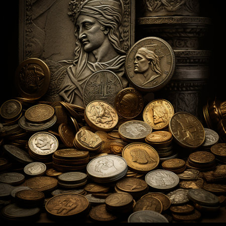 Step into the world of Vintage Euphoria and be captivated by the mesmerizing artistry found on historic coins and currency. This image transports you to another era, showcasing a magnificent collection of antique coins, banknotes, and precious metal tokens. Each item exudes its own unique charm and cultural significance, representing different time periods and civilizations. The diverse art styles featured include intricate engravings reminiscent of baroque masterpieces and bold illustrations inspired by traditional patterns. Prepare to be awestruck by the craftsmanship behind these antique treasures, evoking a wave of nostalgic fascination among viewers worldwide.