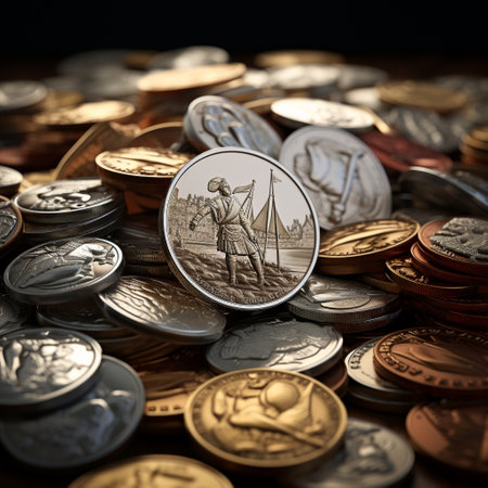 Step into the world of valor and heroism with Coins of Valor, a stunning image showcasing a stack of historic coins reminiscent of various countries and eras. Each coin depicts legendary war heroes from different cultures, capturing their bravery and courage through intricate details and textures. The vibrant, polished finish of the coins highlights their metallic essence, while the composition exudes a sense of reverence and nostalgia. Prepare to be filled with awe as you explore the symbolic representation of valor and bravery embodied in these antique denominations.