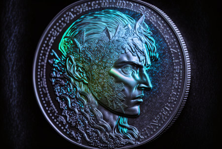 Swedish krona coin with a cyborg, abstract, furry holographic visage.