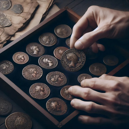 Various coins with intricate designs laid scattered on a wooden table. Collectors examine them closely in a warm inviting setting filled with afternoon light.