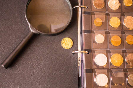 Numismatics. Old collectible coins made of silver on a wooden table.Coins in the album.Collection of old coins. Magnifying glass