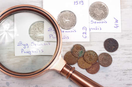 Ancient Grand Duchy of Lithuania coins and magnifying glass. Numismatics concept