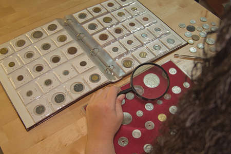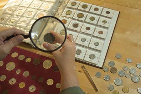 Numismatist restoring old coins with magnifying glass