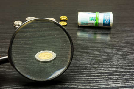 Polish five zloty, through a magnifying glass in the background, other coins and rolls of banknotes.