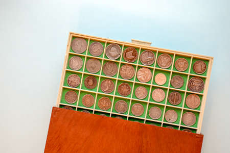 Coin case with numismatic collection of antique coins. Plastic and wooden numismatic album. Selective focus