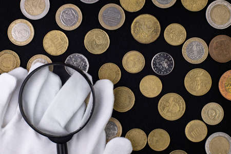 Collection of European coins and collector white gloves on black as background