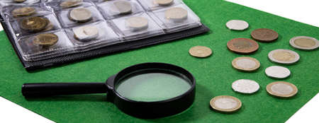 Collection of European coins on green cloth, magnifier and case for storing collectible coins, concept of storage and saving money