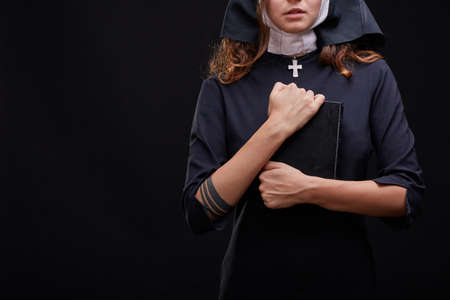 Beautiful young nun in religion black suit holds Bible and posing on camera with big book on a black background. Religion concept. Black and white