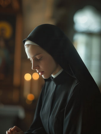 A portrait of a serene Caucasian nun, wearing a black habit, deep in prayer within a dimly lit church.