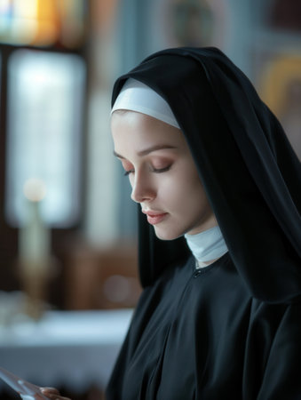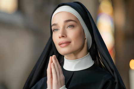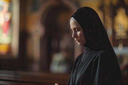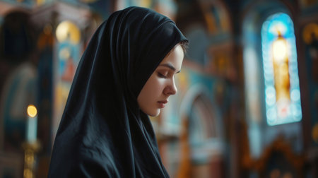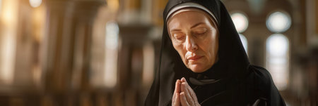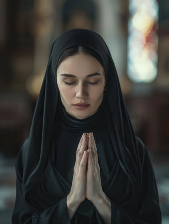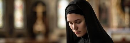 A serene Caucasian nun in a black habit deep in prayer inside a church, creating a devout portrait.