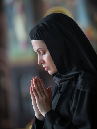 A serene nun, clad in black, stands in deep prayer inside a dimly lit church, her hands clasped together in a gesture of devotion.
