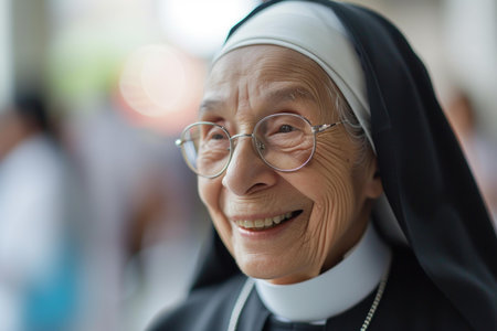 Closeup portrait of a cheerful elderly nun wearing glasses and smiling warmly
