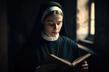 Selective focus medium closeup of two ethnically diverse nuns holding books in hands and reading religious texts