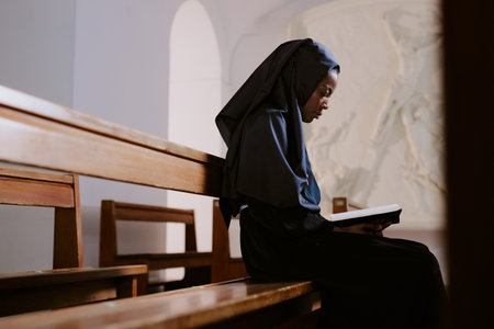 Medium shot of modern African American nun reading religious texts while sitting on pew in catholic church., copy space