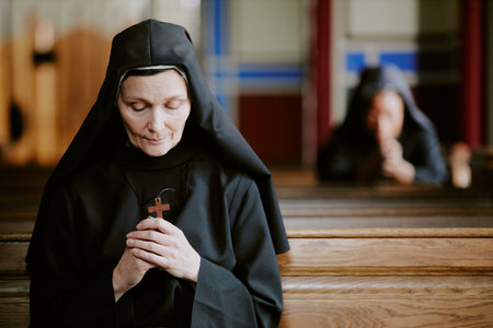 A caucasian nun in a black habit prays devoutly inside a church. The image captures a moment of peaceful reflection.