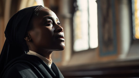 Middle aged African American nun praying in catholic church.