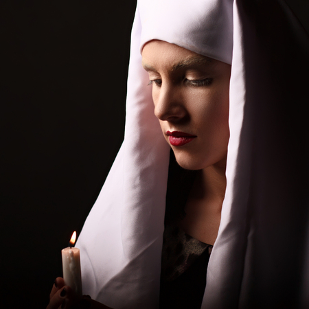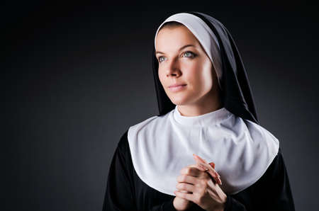 Pretty religious nun in religion concept against dark background.