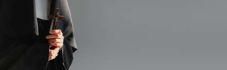partial view of nun in black vestment holding cross isolated on gray, banner