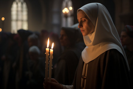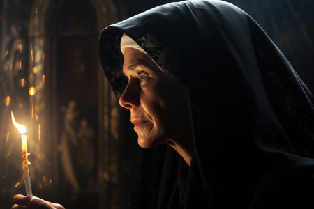 A peaceful Caucasian nun in black habit is seen praying in a dimly lit church, her face softly illuminated by candlelight, radiating peace.