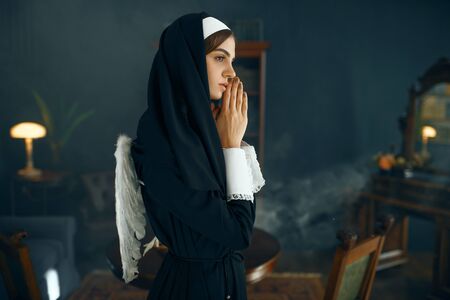 Religious concept, person prays to god, nun, faith bible, church. member of religious community of laurel monastery, penance.