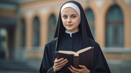A young nun stands outside a building with a Christian symbol and a Bible. GENERATE AI