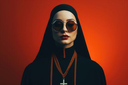 Modern fashion nun in sunglasses on red background