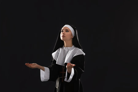 Young praying nun on dark background