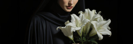 Beautiful young girl in mourning attire with a bouquet of white lilies, close-up of a widow, banner