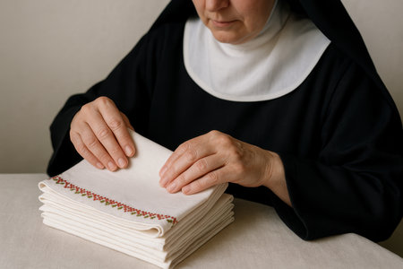 Elderly nun carefully folding embroidered lines at table, demonstrating peaceful daily routine and religious commitment.