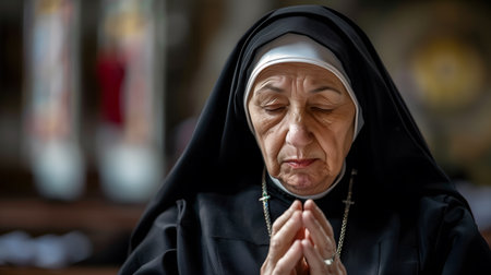 Elderly nun, in black habit, deeply engrossed in prayer inside a church. Eyes closed, hands clasped, seeking solace and connection with a higher power.