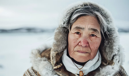 Portrait of an elderly indigenous woman of the northern peoples of Canada in traditional national clothing outdoors