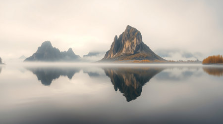 Panoramic view of a mountain reflected in the calm lake.