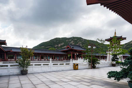 Building of Chinese buddhist temple in Mount Luojia, which lies in the Lotus Sea to the southeast of Putuo Mountain, Zhoushan, Zhejiang, the place where Bodhisattva Guanyin practiced Buddhism