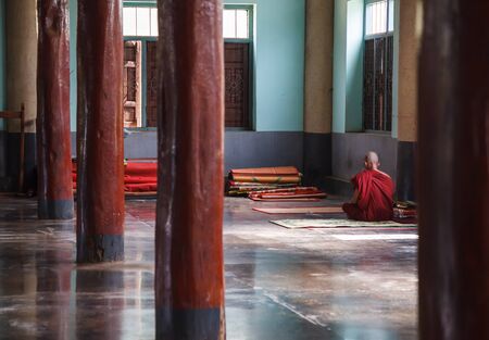 Payathonsu, Myanmar - December 30, 2018: Buddhist Monk meditating at chapel peaceful corner, Tai Ta Ya Monastery Buddhist Temple. Day Trip Thailand Myanmar Tourist Attraction and Destination Concept.