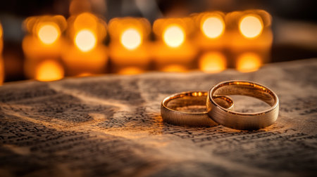 Two elegant golden wedding rings rest gently on open Bible pages, softly illuminated to symbolize love and commitment in a beautifully romantic setting.