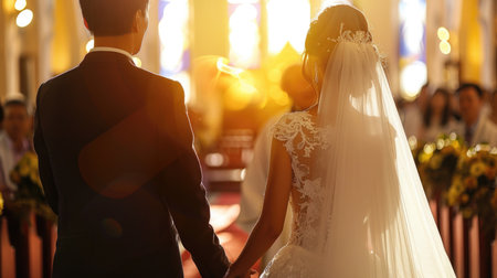 Wedding couple in love, back view, walking along the aisle church. Ceremony on the day of the wedding. Generative AI