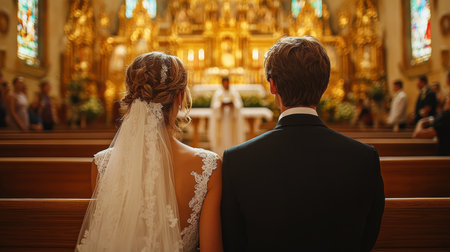 Couple in Elegant Attire During Wedding Ceremony in Historic Church With Beautiful Stained Glass and Golden Altar Decorations Generative AI