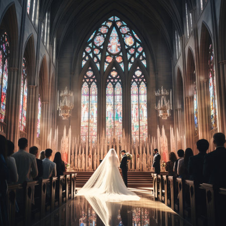 Step into a mesmerizing Gothic cathedral where a wedding scene unfolds. Adorned with vibrant stained glass windows and intricate stone carvings, this cathedral provides a stunning backdrop to the sacred ceremony. The bride, dressed in an elegant white gown, stands at the altar alongside the groom, resplendent in a tailored black tuxedo. Surrounded by their loved ones, all dressed in celebratory attire, they witness the union with joy and reverence. Soft light filters through the stained glass, casting a captivating interplay of colors on the marble floors. In this transcendent atmosphere, the couple's union is sealed in sacred communion, representing love, devotion, and eternal union.