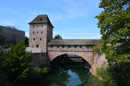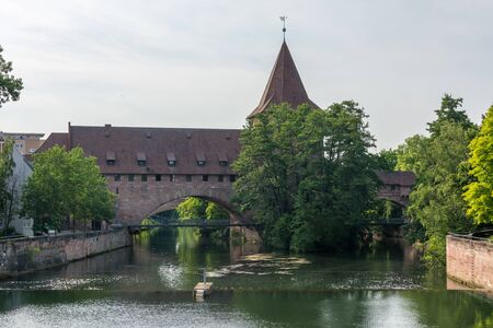 Scenic view of Henkerhaus Museum, Wasserturm, and both medieval bridges Henkersteg and the second wooden bridge in Nuremberg, Bavaria, overlooking the Pegnitz River.